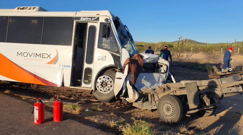 Protección Civil Sonora atiende el reporte de un accidente en la carretera Caborca-Sonoyta km. 159, en donde un autobús de la Mina Noche Buena se impactó contra un vehículo pick up, dejando como saldo hasta el momento de 1 persona sin vida y 22 lesionadas, mismas que ya se trasladaron y se atienden en varias clínicas de Caborca.