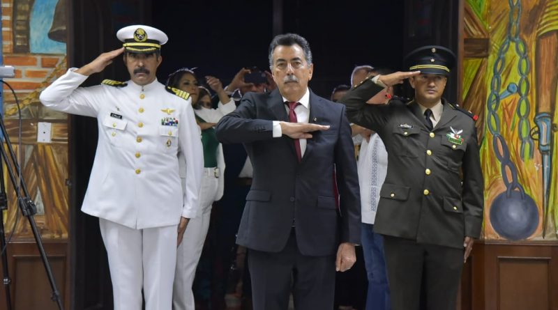 Frente a palacio municipal, representantes de las cámaras empresariales, de los sectores productivos, rectores y de la sociedad civil organizada, así como funcionarios y regidores fueron testigos de la ceremonia cívica, guardando la sana distancia en un escenario al aire libre y conservando los protocolos sanitarios ante la contingencia.