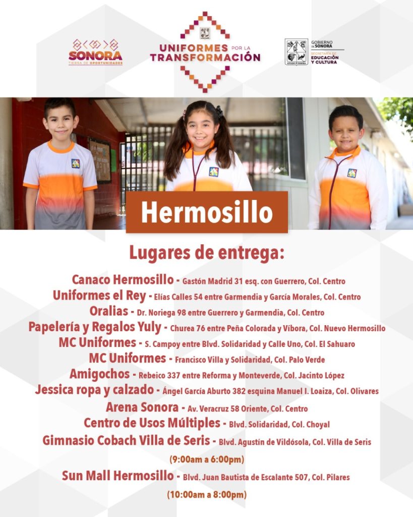 Hermosillo. Con el objetivo de eficientar el proceso de entrega de los paquetes de uniformes escolares deportivos gratuitos a padres y madres de familia, así como tutores, la Secretaría de Educación y Cultura (SEC) ampliará el número de centros de distribución en Hermosillo y Cajeme.