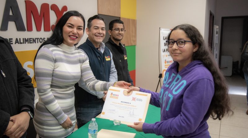 Hermosillo. Por su servicio voluntario en el Banco de Alimentos de México en Hermosillo (BAMX), Rebeca Valenzuela Álvarez, directora general del Instituto Sonorense de la Juventud (ISJ), entregó reconocimientos a jóvenes participantes del programa “Nutriendo Conciencias”.