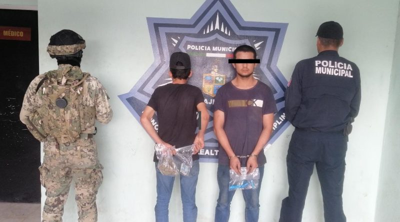 Al aprehenderlos se procedió con una inspección corporal localizándoles entre sus pertenencias 15 envoltorios de marihuana, 9 dosis de cristal y un total de 200 pesos en efectivo.