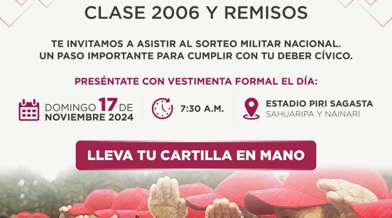 El Gobierno Municipal a través de la Junta Municipal de Reclutamiento de Cajeme informa que el próximo domingo 17 de noviembre se realizará el Sorteo Militar Nacional para los jóvenes Clase 2006 y remisos, a partir de las 7:30 de la mañana en el Estadio Manuel “Piri” Sagasta.