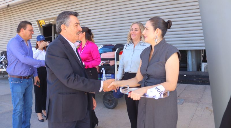 Da bienvenida presidente municipal de Cajeme Javier Lamarque a pasajeros del vuelo inaugural Monterrey-Ciudad Obregón
