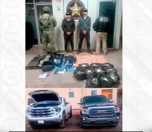 En Bácum, AMIC y DEFENSA capturan a dos sujetos con armas, narcótico y dos vehículos